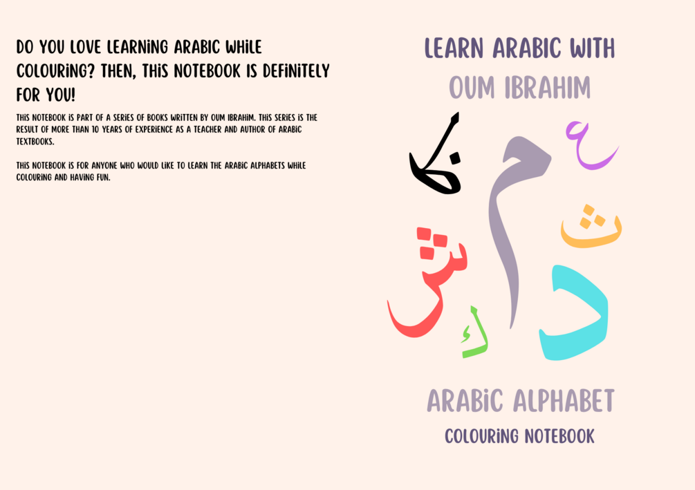 This notebook is part of a series of books written by Oum Ibrahim. This series is the result of more than 10 years of experience as a teacher and author of Arabic textbooks. This notebook is for anyone who would like to learn the Arabic alphabets while colouring and having fun.